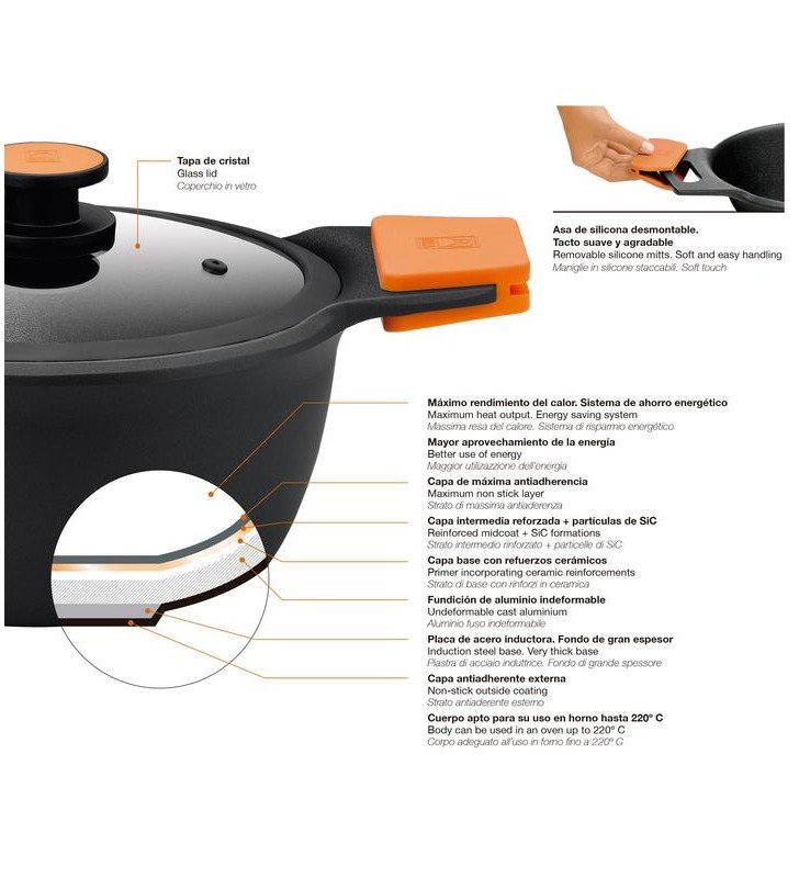 Es apta para todas las fuentes de calor (incluida la inducción) gracias a su fondo difusor full induction. Además tiene un excelente reparto de la temperatura para una cocción perfecta de todas nuestras recetas.
